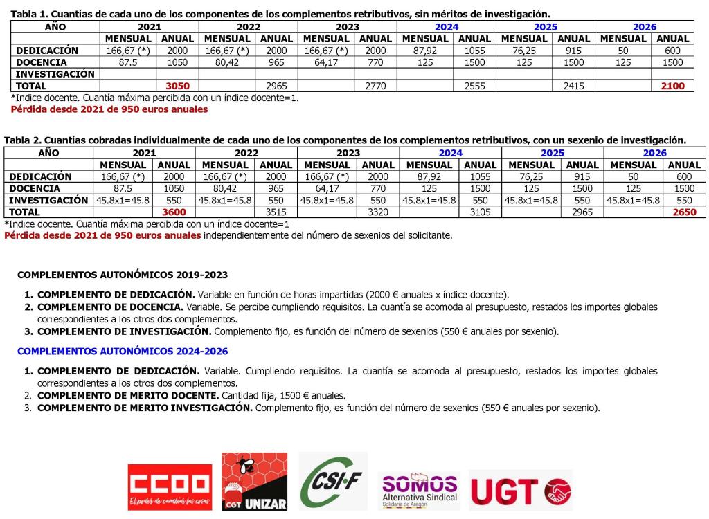 Las organizaciones sindicales EXIGIMOS una financiación estable y suficiente y la apertura inmediata de una negociación para acordar un nuevo modelo de complementos retributivos, que ponga fin a los recortes salariales anuales encubiertos y garantice unas retribuciones dignas, previsibles y acordes con la labor que desarrolla el PDI de la Universidad de Zaragoza.